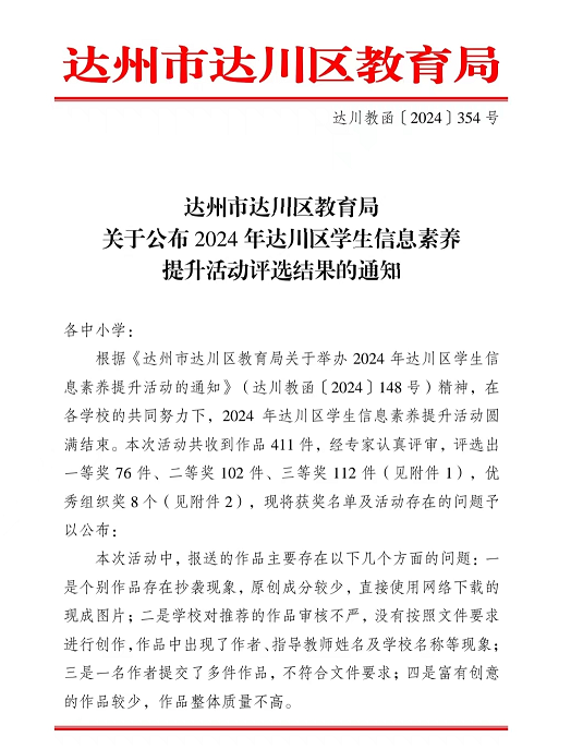 近日,达州市达川区教育局公布了2024 年达川区学生信息素养活动评选结果。达川中学共有三位同学获奖,其中电脑绘画项目张敏老师指导的邓婕妤同学和唐红老师指导的颜束珊同学作品获得一等奖!唐红老师指导的李怡乐同学作品获得三等奖!