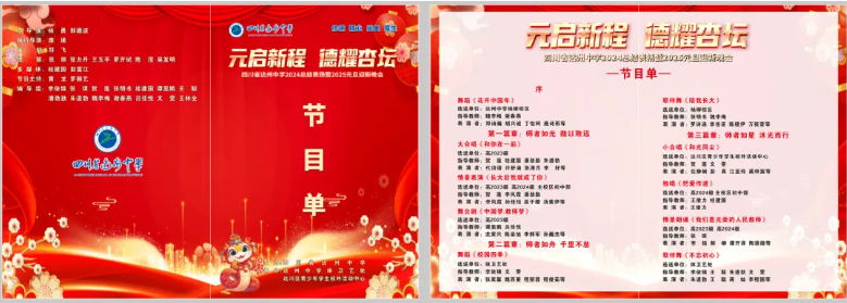 元启新程,德耀杏坛。12月26日晚,四川省达州中学在翠屏校区艺体馆二楼举行2024总结表扬暨2025元旦迎新晚会。全校师生线上线下欢聚一堂,共同度过了一个精彩纷呈、令人难忘的夜晚。 晚会在活力四射的开场舞《花开中国年》中拉开帷幕,舞者们用曼妙的舞姿瞬间点燃了现场气氛,台下观众掌声雷动、欢呼声不断。随后,合唱、朗诵、情景表演等各类节目轮番上演,不仅展现出别样的魅力,为观众呈现了一场视听盛宴,更拉近了师生间的距离,让现场充满了温馨与感动。 晚会节目单 除了精彩的节目表演,晚会还对学校2024年度工作进行了总结表扬,先后颁发“最美教师”“荣休教师”“教育质量特别贡献”等奖项。获奖教师纷纷表示,将永葆教育初心,牢记育人使命,为学校高质量发展积极做出新贡献。 回首过往,一路收获满满;展望未来,一定宏图大展。我们坚信,在区委区政府的坚强领导下,在全校师生的共同努力下,达州中学各项工作必将开创新局面、取得新突破、展现新作为,为助力擦亮“学在达川”品牌、接续谱写“老家达县·宜美达川”新篇章做出新的更大贡献!
