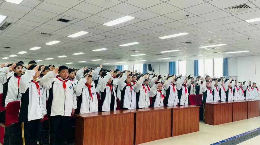 在重温入队誓词与呼号环节,队员们高举右拳,在刘力荣的带领下庄严宣誓,铿锵的“时刻准备着”响彻会场,展现出新时代少先队员的风采。