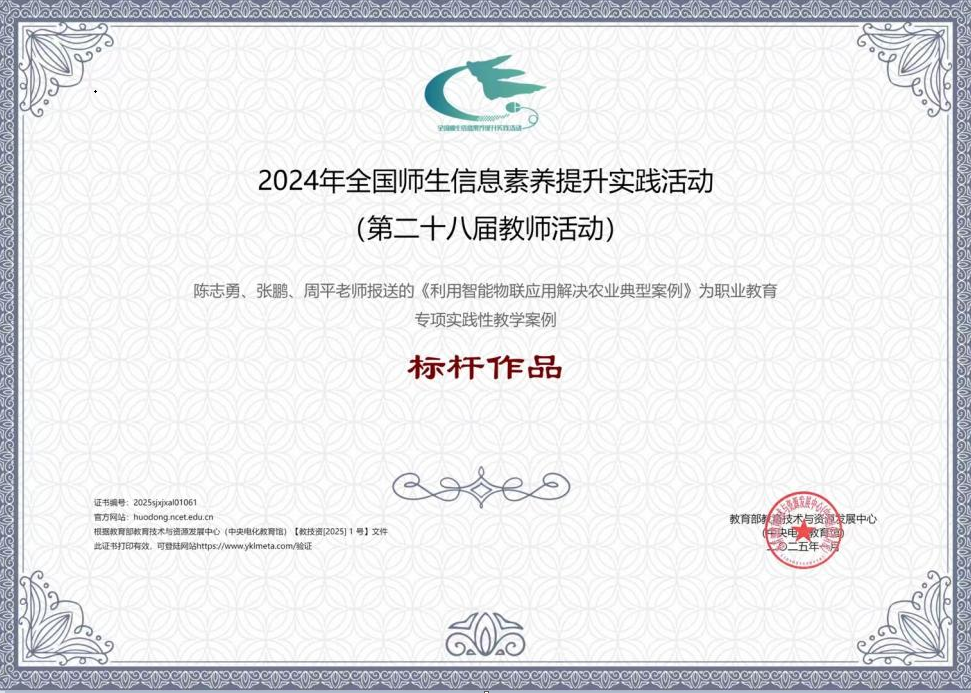 近日,由教育部教育技术与资源发展中心主办的第二十八届全国师生信息素养提升实践活动评选结果揭晓。四川三河职业学院通识教育学院陈志勇团队报送的职业教育专项实践性教学案例——《利用智能物联应用解决农业典型案例》,从全国4066件参赛作品中脱颖而出,获评最高等级“标杆作品”。