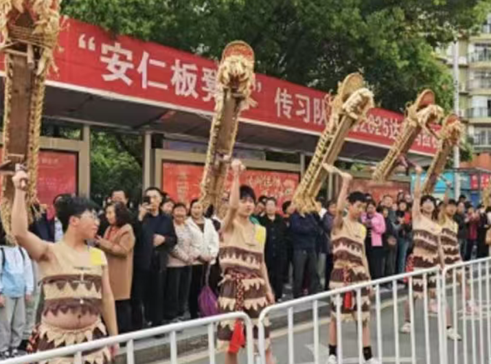 4月13日,2025达州马拉松暨“跑遍四川”达州站在达州城区鸣枪起跑,达县职业高级中学安仁板凳龙传习队在领域广场为赛跑者和市民带来了一场传统文化与现代体育融合的激情表演,成为赛道旁亮眼的风景。 传习队员们手持长约1.5米的特制板凳龙,通过腾挪、翻转、跳跃等动作,将龙舞的灵动与力量展现得淋漓尽致,引得现场观众阵阵欢呼。同时也向全国展示了达州深厚的文化底蕴。 传习队指导老师谭浩强表示:“我们希望通过马拉松这一平台,让更多人了解和热爱安仁板凳龙,推动非遗文化的传承与创新。