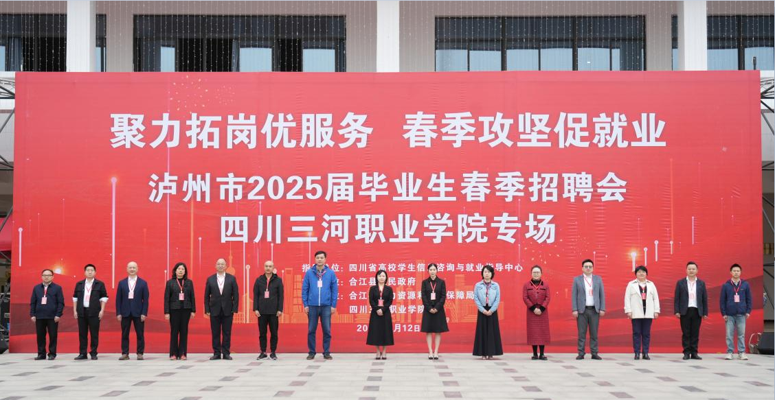 近日,四川三河职业学院 2025 届毕业生春季双选会在学校综合教学楼前坪隆重举行。本次双选会以 “聚力拓岗优服务・春季攻坚促就业” 为主题,由四川省高校学生信息咨询与就业指导中心、泸州市人力资源和社会保障局指导,合江县人民政府主办,合江县人力资源和社会保障局、四川三河职业学院承办。泸州市人力资源综合服务中心大学生就业服务科科长张耀华,合江县人力资源和社会保障局局长贾泽容,合江县就业服务管理局局长刘颖,学校党委副书记、副校长王华,副校长何俊琳,就业指导中心主任李联春及各二级学院领导出席了此次活动。
