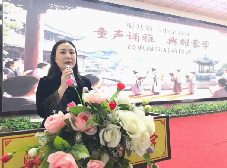 学校党委副书记、校长郭娟在致辞时强调,诗词是时光的琥珀,凝着《关雎》的纯真、《观沧海》的壮阔;是情感的琴弦,拨动天涯比邻的牵挂、寸草春晖的温情。本次活动以“童声诵雅 典耀蒙学”为主题,旨在通过诗词这一中华文化瑰宝,引导孩子在经典诵读中感悟文化精髓、厚植家国情怀。她指出,诗词不仅是语言艺术的结晶,更是民族精神的载体。本届诗词大会已形成班班参与、人人竞诵的浓厚氛围,今天,这方舞台不仅是竞技的沙场,更是诗意的原野。愿孩子们以词句为翼,在飞花令中逐月,于组诗间织云。愿此会为孩子们推开一扇门,门后是浩瀚的文明长河,是永不褪色的东方之美。 期待孩子们以诗会友、以赛促学,展现三小学子“腹有诗书气自华”的精神风貌。