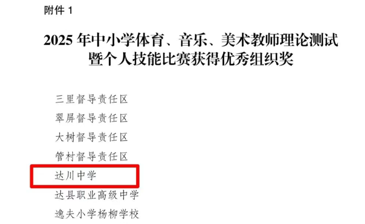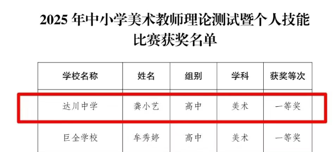 四月下旬,达州市达川区教育局在逸夫小学杨柳学校举办了2025年度中小学体育、音乐、美术教师理论测试暨个人技能比赛活动。达川中学共有6名教师参赛,并取得了良好的成绩。其中,庞艳老师获初中美术组一等奖,袁诗莲老师获高中音乐组一等奖,龚小艺老师获高中美术组一等奖,郭小沅老师获高中体育组一等奖,郎佳凤老师获二等奖,王小涛老师获三等奖。达川中学获得“优秀组织奖”。