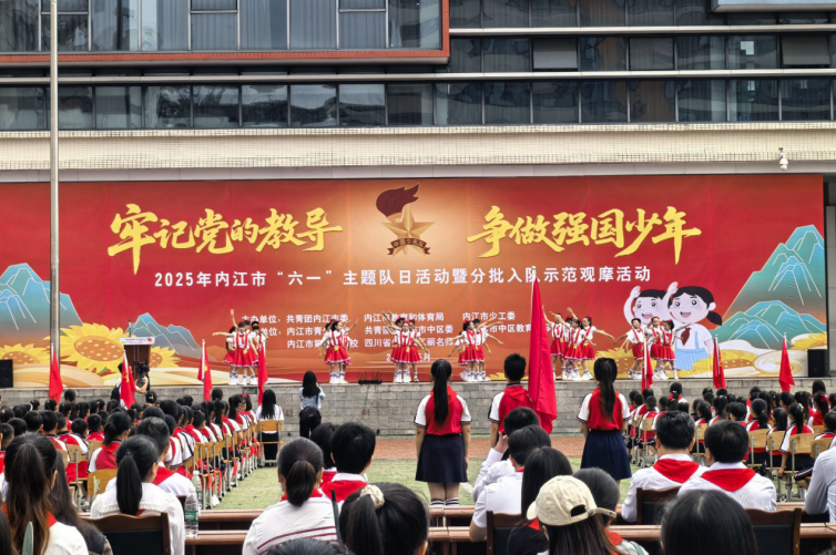 在充满希望与活力的“六一”国际儿童节即将来临之际,内江市第一小学校校园内洋溢着庄严而热烈的氛围。5月28日,学校成功举办“红领巾心向党’六一主题队日活动暨分批入队示范观摩活动”。本次活动不仅是一次隆重的入队仪式,更是一次面向市少先队组织的精彩示范,充分展现了学校少先队工作的规范有序、特色鲜明和师生昂扬向上的精神风貌。