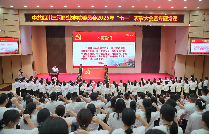 在庆祝伟大的中国共产党成立104周年之际,7月1日下午,四川三河职业学院在学术报告厅开展2025年“七一”表彰大会暨专题党课,举行隆重的预备党员入党宣誓仪式、“两优一先”表彰、党委书记讲专题党课,全校党员、发展对象、教职工入党积极分子350余人参加大会,大会由党委副书记王华主持。