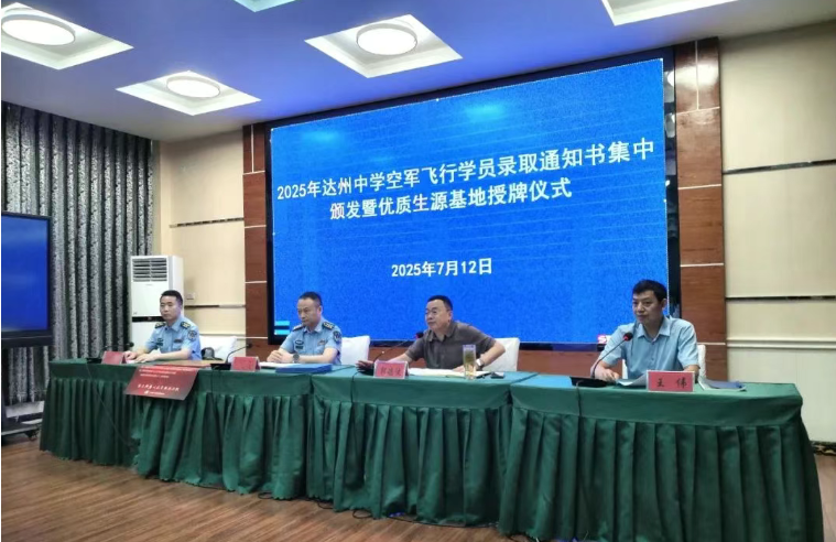 7月12日上午9时,四川省达州中学行政楼201会议室气氛庄重而热烈,2025年空军飞行学员录取通知书集中颁发暨优质生源基地授牌仪式在此隆重举行。空军招飞局成都选拔中心相关负责人,达州中学校长郭德波等领导出席仪式。仪式由达州中学副校长王伟主持。