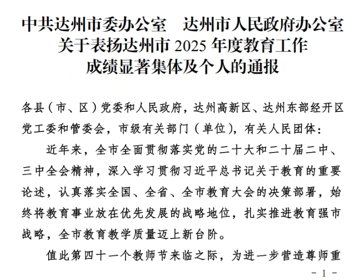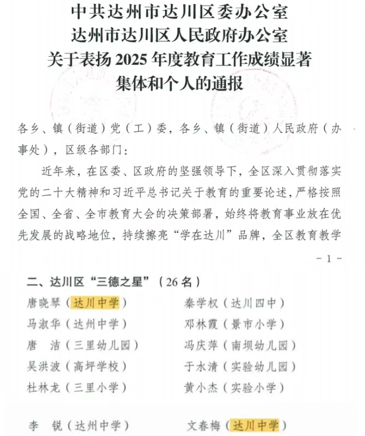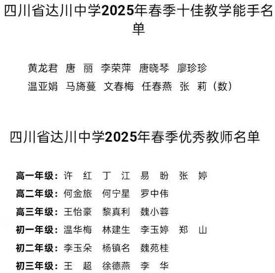 根据中共达州市委办公室《达州市人民政府办公室关于表扬达州市2025年度教育工作成绩显著集体及个人的通报》及中共达州市达川区委办公室《达川区人民政府办公室关于表扬2025年度教育工作成绩显著集体和个人的通报》,我校22名教师获市级、区级荣誉。同时,依据《四川省达川中学优秀教师、教学能手遴选办法》,经严格考评,学校授予黎真利等20名教师“优秀教师”称号,黄龙君等10名教师“十佳教学能手”称号。