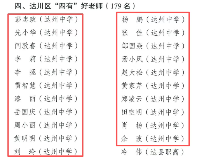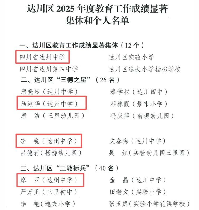 近日,为进一步营造尊师重教良好社会风尚,建设一支新时代高素质专业化教师队伍,促进教育事业不断发展,达川区委、区政府决定对教育工作成绩显著集体和个人予以通报表扬。达州中学荣获达川区教育工作成绩显著集体;马淑华、李锐荣获达川区“三德之星”;廖丽、张峻源、杨霜、周寻、王虹潞荣获达川区“三能标兵”;彭忠政、先小华、闫敦春、李莉、李拯、雷智慧、漆丽、岳国庆、周小丽、黄明明、刘玲、杨鹏、张佳、邹国焱、汤小凤、赵大松、黄家芹、郑凌云、田空明、肖杨、余波荣获达川区“四有”好老师;杨刚、刘召梅、陈维权荣获达川区教育工作突出个人。 达州中学全体教职员工将再接再厉,坚决贯彻党的教育方针,以为党育人、为国育才为根本目标,大力弘扬和践行教育家精神,立德修身、敬业立学、教书育人,为全区教育事业发展做出新的更大贡献。