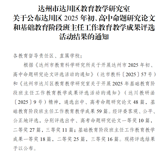 近日,达川区教育教学研究室公布了2025年初、高中命题研究论文评选结果,四川省达川中学共有6位教师获奖,其中,黎真利、刘瑞2位老师获得一等奖;易盼、郭晓琴、郑楷芳、何壕4位老师获得二等奖,体现了川中教师队伍的教学研究能力和专业素养。