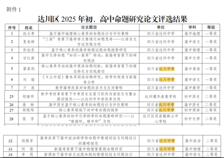 祝贺!四川省达川中学6位教师的命题研究论文喜获佳绩