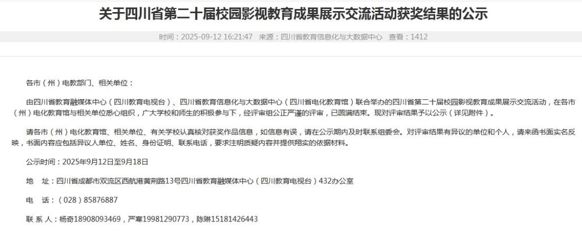 近日,由四川省教育融媒体中心与四川省教育信息化与大数据中心联合举办的“四川省第二十届校园影视教育成果展示交流活动”获奖结果公示。四川省达川中学三部影视作品在全省众多参赛作品中脱颖而出,其中教学微视频类《唱脸谱》获得一等奖,校园专题单元《师爱如光微以致远》获得二等奖,校园影视综合单元《非遗进校园武艺展芳华》获得二等奖。 此次获奖充分展现了达川中学在当前智慧教育大环境下,灵活运用影视教育、艺术创作等手段促进学生综合素养培养方面所取得的优异成果,也体现了全校师生积极创新、勇于实践的精神风貌。学校将继续推动智慧校园建设,鼓励更多师生参与优质教育资源的创作与传播,不断提升校园文化影响力和育人实效。 再次向获奖老师们表示热烈祝贺!愿大家再接再厉,共创更多精彩!