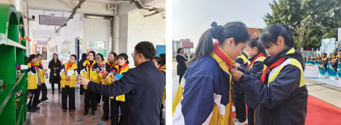 活动开篇,绿然学校校门口的小学生特色表演与红领巾佩戴仪式,让教师们瞬间融入小学氛围。从队列整齐的表演到庄重的佩巾环节,教师们细致捕捉小学仪式感对幼儿适应的影响,为后续衔接教育积累直观素材。随后的校园与教室参观环节,教师们以幼儿视角出发,重点关注课堂座位排布、教学道具使用等细节,梳理环境适配的衔接要点。