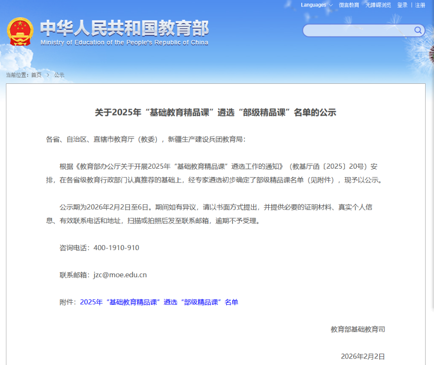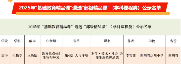 2月2日,教育部基础教育司在教育部官网公示2025年“基础教育精品课”遴选“部级精品课”名单,达州中学李雪莲老师成功入选。