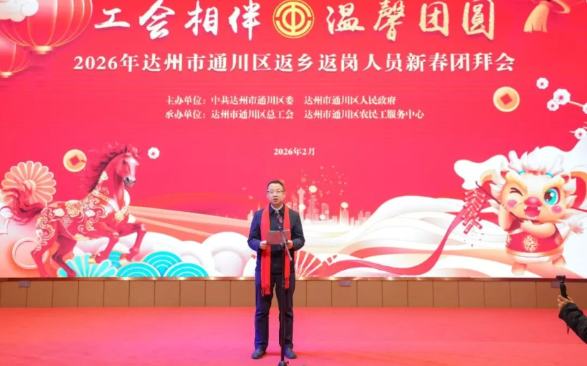 新春将至,年味渐浓。为切实做好返乡返岗人员服务保障工作,传递党和政府的关怀与温暖,营造关爱务工人员、致敬奋斗者的浓厚社会氛围,2月9日下午,由中共达州市通川区委、通川区人民政府主办,通川区总工会、通川区农民工服务中心承办的2026年返乡返岗人员新春团拜会,在达州市工人文化宫凤凰山厅温情举行。达州市总工会党组成员、副主席向茂林,通川区人民政府副区长李征坤,区总工会党组书记、副主席李良,区农民工服务中心党组书记、主任邓红霞等领导出席活动。来自各乡镇(街道)、通川经开区、莲湖景区的工会负责人与优秀返乡返岗人员代表欢聚一堂,共迎新春、共话发展。 李征坤代表区委、区政府向辛勤奋斗在全国各地、为家乡发展默默奉献的广大在外务工人员致以诚挚的问候和新春的祝福。他充分肯定了大家为城市建设和家乡发展作出的重要贡献,并表示区委、区政府始终高度重视对在外务工人员的服务保障工作,将持续优化服务、维护权益、排忧解难。他鼓励大家在新的一年里,继续发扬吃苦耐劳、拼搏进取的精神,积极关注和投身家乡建设,携手共创通川更加美好的未来。 现场,文艺演出精彩纷呈,节目形式丰富多样,洋溢着浓厚的年味与乡土情怀,赢得阵阵掌声。活动中,向茂林、李征坤等领导上台为返乡返岗人员代表送上新春慰问,亲切交谈并合影留念,传递党和政府与工会组织的温暖关怀。随后进行的抽奖环节,由本地爱心企业天猫优品和京东家电倾情赞助,更添喜悦气氛。现场掌声与欢笑不断,真情与暖意交融,始终洋溢着喜庆热烈、温馨团圆的浓厚氛围。 席间,领导们与返乡返岗人员代表亲切交流,拉家常、问冷暖,详细了解大家在外的工作生活情况和实际需求,听取他们对家乡发展的意见建议。现场气氛热烈,洋溢着欢声笑语和浓浓的乡情亲情。 为确保此次活动顺利开展,区总工会提前部署、周密安排,各基层工会积极动员、认真组织,严格按照要求选派代表并做好安全保障工作。活动不仅为返乡返岗人员提供了一个情感交流、信息互通的平台,也进一步宣传了工会服务政策,增强了工会组织的凝聚力和影响力。