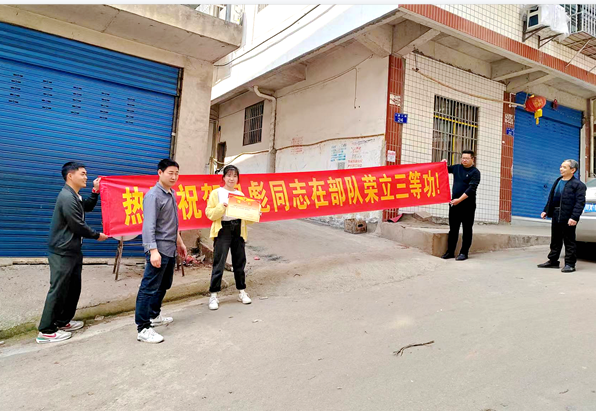 为增强军人荣誉感和家属自豪感,促进军人荣誉体系建设,在全社会营造尊崇军人的浓厚氛围,3月15日,邻水县坛同镇组织镇村干部将三等功臣之家牌匾和奖金1000元送到坛子坝社区新农村小康二路现役军人吕彪妻子蒋娜手中。