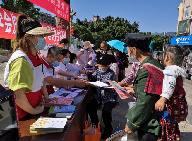 (图为县疾控中心和红十字会工作人员发放宣传单和讲解政策)
