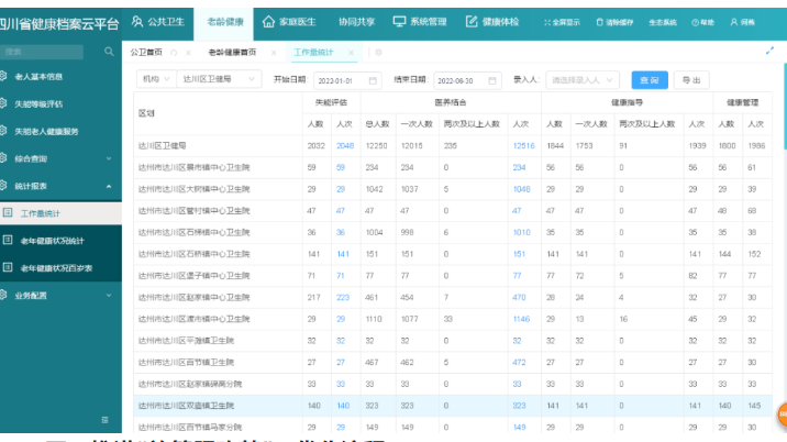为实现“以人为核心,建立全生命周期个人健康云档案”目标,充分利用现有四川省居民健康档案云平台作支撑,努力推进四川省老年健康服务信息管理系统应用,打造覆盖家庭、社区和机构的智慧健康养老服务网络,推动老年人的健康和养老信息共享、合理利用,全面支撑大公卫业务,全面支撑老年健康工作。据统计,统计,全区65岁及以上老年人共119699人,其中男性57735人、女性61964人;年龄在65岁至69岁42815人、70岁至79岁54444人、80岁以上22440人。2022年启动实施的65岁及以上失能老年人“健康敲门行动”,全区39家基层医疗卫生机构分别利用组织医务人员开展基本公卫健康体检服务契机,对提出申请的1800名失能老年人上门免费提供“三个一”(即开展一次上门健康管理,提供一套上门健康指导,开通一条健康咨询热线)服务,真正将“民生无小事,枝叶总关情”落细落实,切实增强失能老年人的获得感、幸福感和安全感。