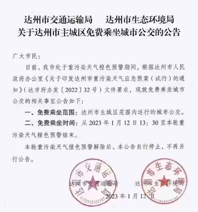 1月12日,从达州市交通运输局、达州市生态环境局获悉,为鼓励、引导市民优先选择公交低碳出行方式,市民可免费乘坐达州市主城区范围内运行的城市公交。