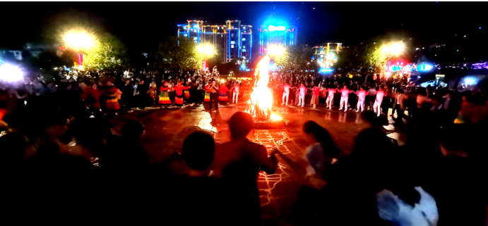台上的演出刚结束,台下的篝火便点燃,熊熊燃烧的火焰,响亮的音乐声,伴随着激动人心的旋律,观众围起了圈子翩翩起舞,把篝火围得水泄不通。