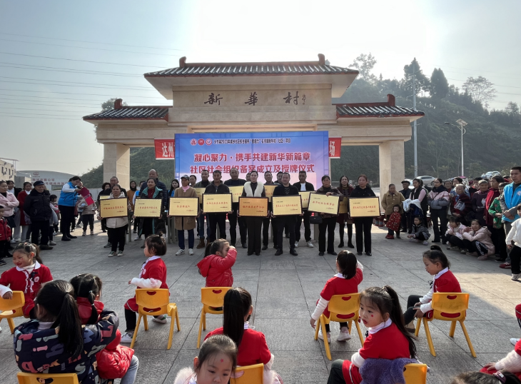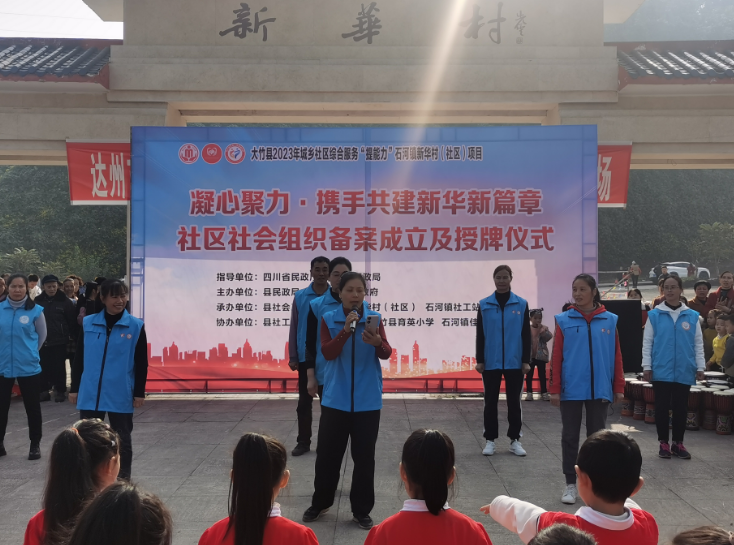 社区社会组织天然根植于基层、贴近生活,是连接党和政府与人民群众之间的桥梁和纽带,是化解基层矛盾的理想载体,是助推乡村振兴的重要组成部分。为进一步加强基层服务,助力社区社会组织发展,推动社区治理“五社联动”模式发展,提高社区工作者队伍整体素质,2023年11月19日,大竹县石河镇人民政府在新华村广场举行“凝心聚力·携手共建新华新篇章”社区社会组织备案成立授牌仪式。大竹县民政局和石河镇政府有关领导、大竹县社会工作服务中心、石河镇社工站以及新华村居民等共计200余人参加了本次活动。