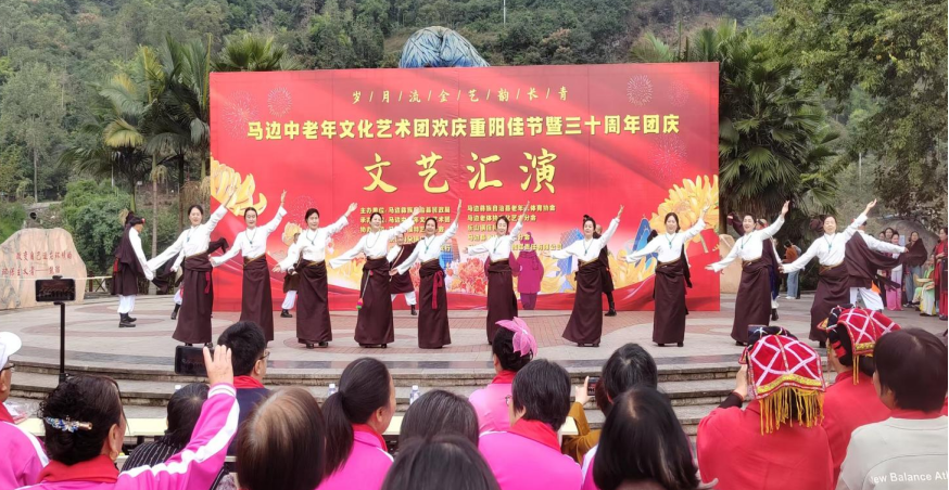 10月30日上午,马边彝族自治县张坝社区熊猫广场座无虚席,热闹非凡,现场洋溢着一片喜庆、欢乐、祥和的浓厚氛围。以“岁月流金·艺韵长青”为主题的马边中老年文化艺术团欢度重阳佳节暨成立30周年团庆文艺汇演活动在此隆重举行。