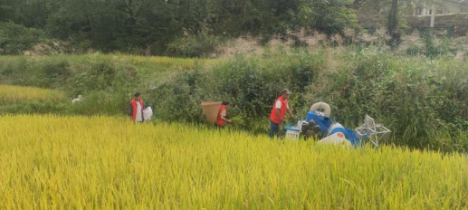 顶着炎炎烈日,身着“红马甲”的党员干部深入田间地头,割稻、拾稻、运稻、装袋……大家干得热火朝天,汗流浃背,一抹抹“志愿红”和金灿灿的稻田交相辉映,勾勒出一幅幅和谐美好的秋收助农图景。