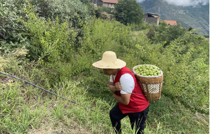 (龙坝乡党员干部帮助果农背果到选果地点)